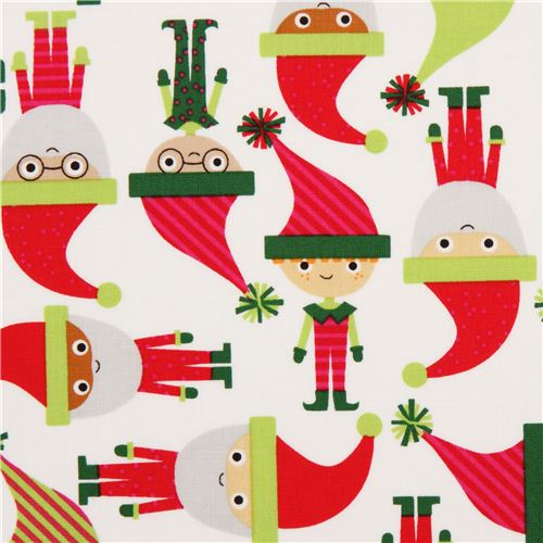 tissu en coton blanc avec des Pères Noël rigolos et des lutins