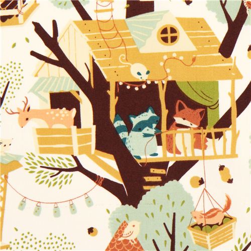 par Birch FabricsTissu bio avec des animaux de la forêt tissu en coton crème avec des animaux de la forêt comme un daim, un renard, un hérisson, un écureuil, un raton-laveur, un lapin, etc ... dans des maisons dans les arbres tissu de très grande qualité, excellente qualité typique des tissus Birch