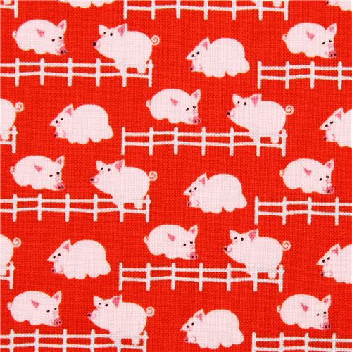 tissu en coton rouge avec plein de cochons roses et des barrières