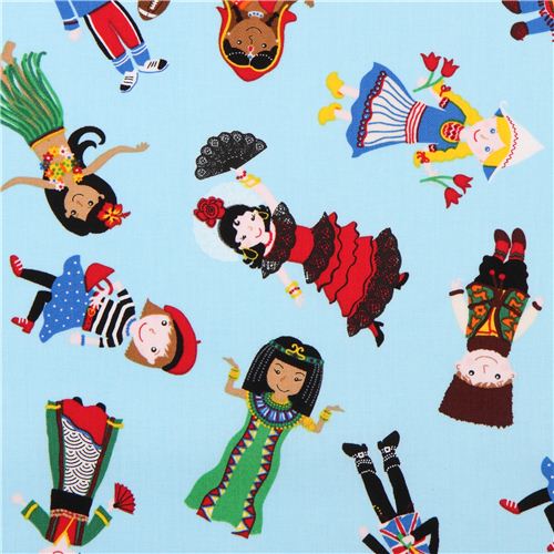 tissu en coton bleu ciel avec des enfants internationaux portant des tenues traditionnelles