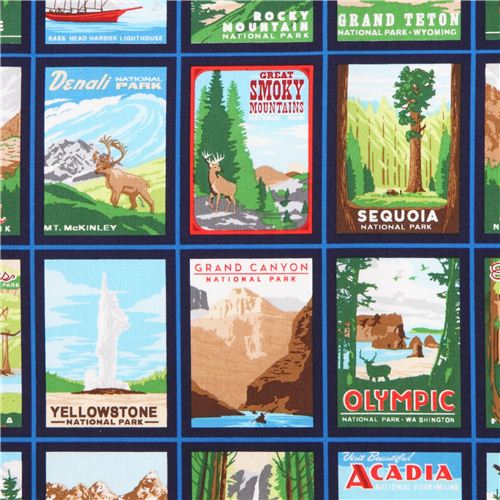 tissu en coton bleu avec des posters du Grand Canyon, d'Yellowstone, d'Yosemite, etc ...