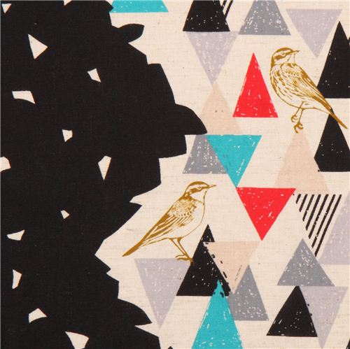 Tissu noir par Etsuko Furuya avec des petits oiseaux et un motif de triangles abstraits multicolores et noirs, 150 cm de large