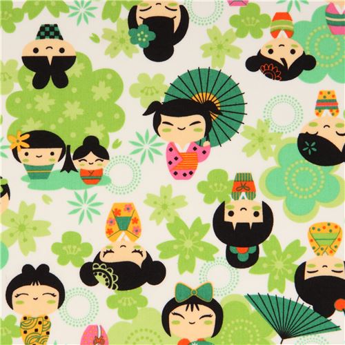 Tissu asiatique Trans-Pacific Textiles avec d'adorables personnages, des fleurs vertes, etc ...