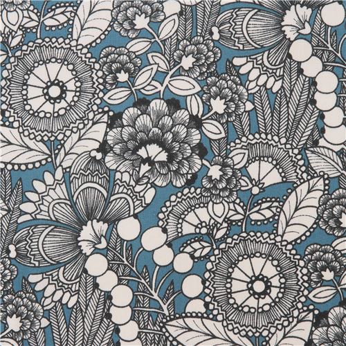Tissu bleu par Alexander Henry avec des fleurs crème clair Tissu
