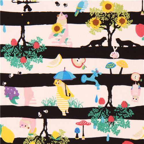 toile japonaise à rayures noires et écru avec des ours, des hiboux, des citrons, des arbres, etc ...