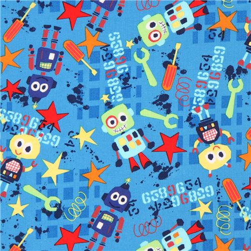 Tissu bleu foncé Michael Miller Bot Boy, robots multicolores, outils, étoiles Tissu