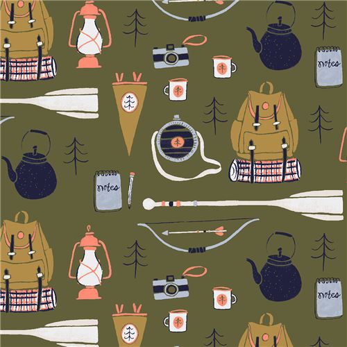 tissu en coton vert mousse avec des pagaies, des sacs à dos, des théières, etc ...