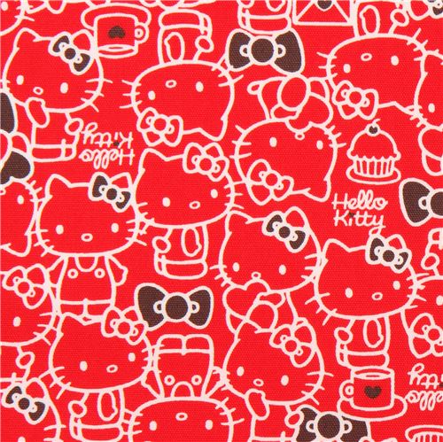 Tissu avec Hello Kitty tissu Oxford rouge avec des silhouettes d'Hello Kitty blanches, des noeuds taupe foncé, etc ... tissu de très grande qualité, excellente qualité typiquement japonaise