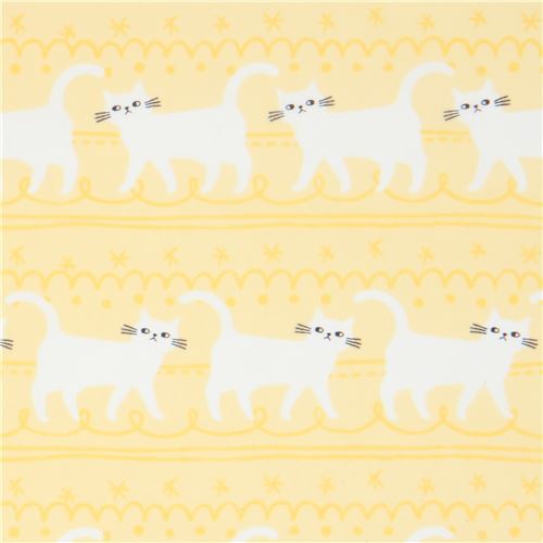 Tissu taffetas en nylon jaune avec des chats Ce tissu jaune super mignon avec d'adorables chatons blancs vous fera penser à ces jolis félins qui vont se promener par une journée chaude et ensoleillée ! Avec des étoiles, des rayures et des boucles en arrière-plan, c'est un motif incroyablement mignon, idéal pour les enfants et tous ceux et celles qui aiment les chats et tous les autres animaux de compagnie ! Ce tissu est imperméable et idéal pour toutes sortes de projets de couture impressionnants.