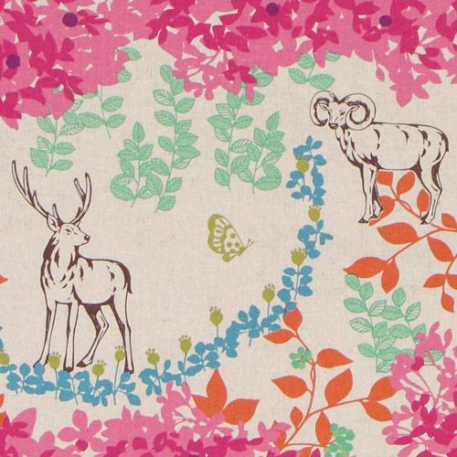 Toile Echino japonaise rose avec des cerfs et un bois Tissu