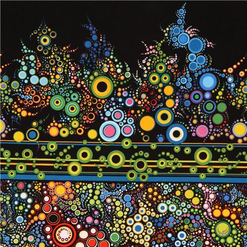 tissu en coton noir avec des cercles multicolores, vert citron, jaunes, roses, bleus, etc ...