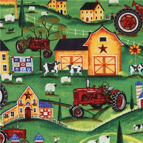 6 Tissu vert avec une ferme, des animaux, des tracteurs et des vaches Fabric by Japanese Indie - modeS4u