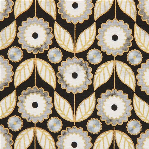 23 Tissu noir avec des fleurs grises et blanches, des décos or métal Fabric by Robert Kaufman - modeS4u