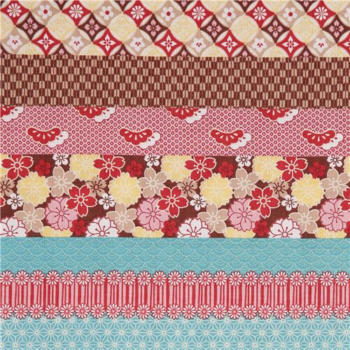 Tissu Dobby Kokka bandes motifs assortis fleurs japonaises tissu texturé en coton rose, vert, rouge, marron, etc. avec des bandes aux motifs assortis, avec des fleurs japonaises, des vagues, des hexagones, des rayures, etc. tissu d'excellente qualité, typique des superbes tissus japonais