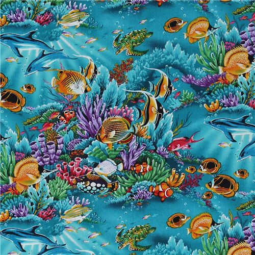 6 Tissu Trans-Pacific Textiles bleu avec des animaux marins tropicaux arc-en-ciel Fabric by Japanese Indie - modeS4u