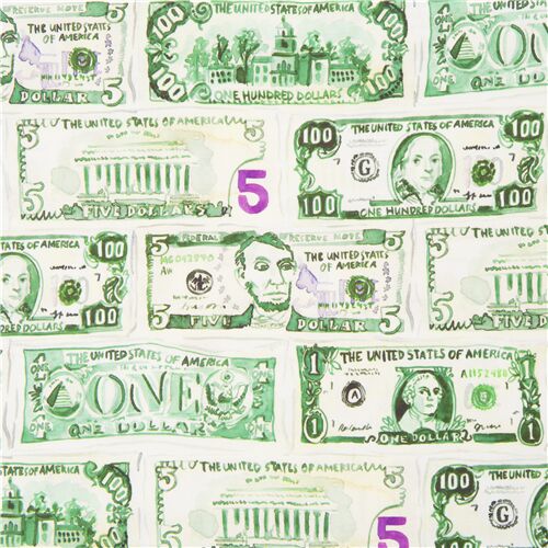 Tissu coton vert et blanc avec des billets des dollars, de l'argent Tissu