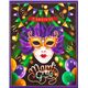 Tissu avec des masques de Mardi Gras par QT Fabrics tissu noir à panneaux avec un motif sur le thème du « Carnival » et de « Mardi Gras », avec un masque doré porté sur un visage, avec des ballons, des bannières, des fanions or, violets, verts tissu très bien conçu, excellente qualité typique de Quilting Treasures 100 % coton, tissu américain