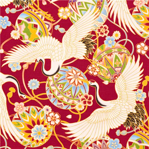 5,46 Tissu Dobby en coton rouge balles temari, fleurs de cerisier sakura et grues Fabric by Cosmo - modeS4u