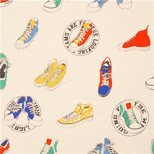 par CosmoTissu japonais crème laminé avec des baskets multicolores tissu Oxford en coton crème laminé avec des chaussures rouges, jaunes, bleues et vertes 100 % coton recouvert de PVC, tissu très bien conçu, parfaite qualité typiquement japonaise