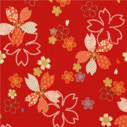 Tessuto floreale rosso fiori ciliegio motivi dorati, Kokka Tessuto
