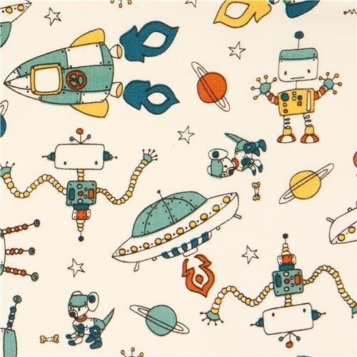 tessuto di cotone bianco panna per maschietti con navicelle spaziali, pianeti, robot e UFO
