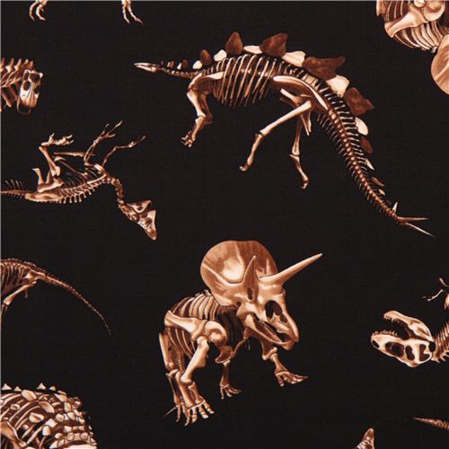Tessuto nero scheletri dinosauri Timeless Treasures USA Tessuto