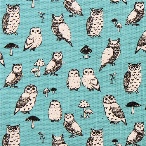 tessuto blu giapponese gufi con molti gufi diversi e funghetti