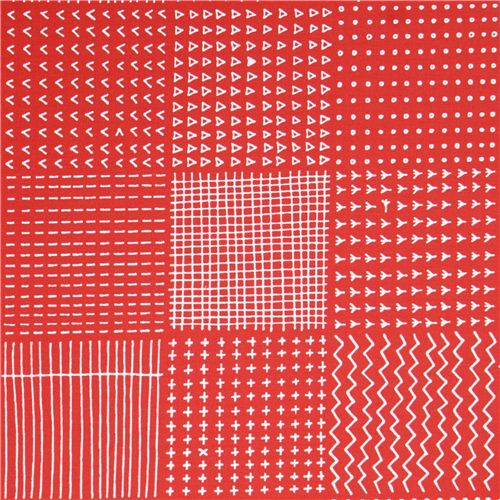 tessuto rosso di cotone a quadri con cerchi, linee e triangoli bianchi