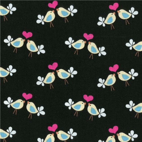 black cotton fabric with many birds in love and pink hearts