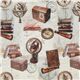 Tessuto beige vintage esploratori Stof France tessuto beige con mappamondi retrò, bussola, libri, scrigni, ecc.