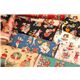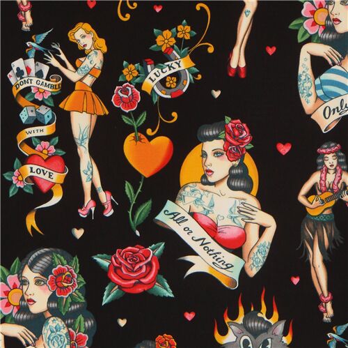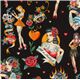 Tessuto nero con donne retrò Alexander Henry tessuto nero con donne, cuori, rose, dadi, carte, ecc.