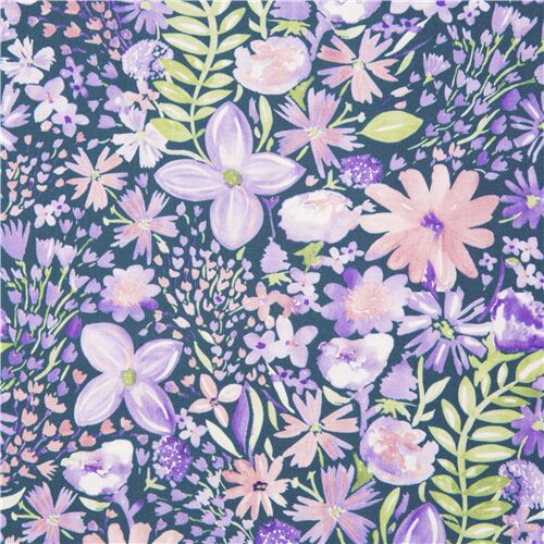 Tessuto blu scuro a fiori Timeless Treasures tessuto blu scuro in cotone con molti fiori viola, lilla, rosa, verde chiaro tessuto di altissima qualità, tipica dei prodotti Timeless Treasures
