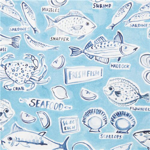 7 tessuto blu pesci crostacei mercato stile acquerello cotone Fabric by Dear Stella - modeS4u