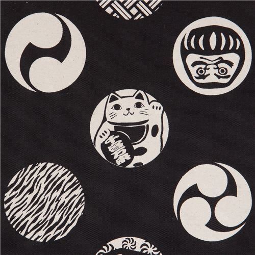Circle Canvas Fabric. black canvas fabric with circles with lucky cats, patterns etc. very high quality fabric, typical perfect Japanese quality