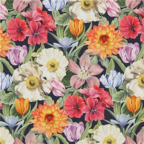navy blue Tana Lawn cotton fabric with tulips and dahlias by Liberty Fabric