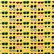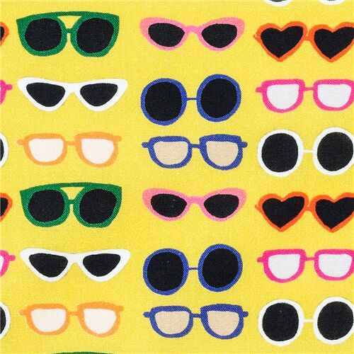 Colourful fun sun sunglasses in rows on a yellow background. Printed on a versatile smooth 100% cotton, perfect for all types of beautiful projects, from dressmaking to bags, patchwork and lots of beautiful summer holiday projects. Made by Stoff France